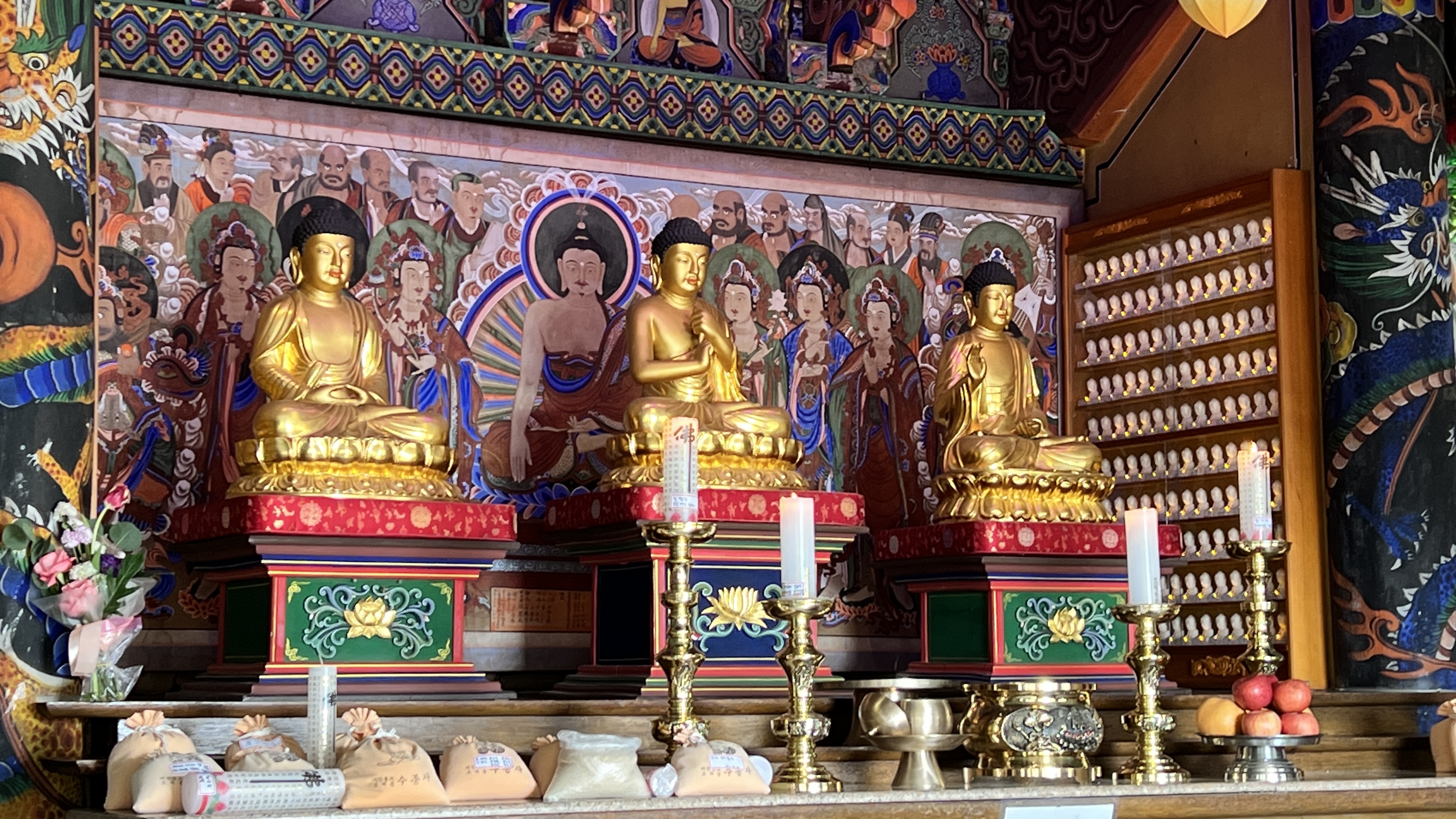 While I digitally collaged images, I juxtaposed the state of Dhritarashtra with the statues of Manjushri, Samantabhadra, and Buddha—Buddhas of the Three Ages. Then, I divided this amalgam of Buddhist figures by separating its color configurations into Red, Green, and Blue—a color model that the pixels of electronic systems display. Through this process, this being, both human and godlike, possesses a generous heart and humble strength, seeking to offer comfort to others. Driven by a pure and affectionate intent, it evolves from a simple and noble existence into a space that invites and holds others with open arms. The way the painting is excavated—light strokes and multi-layers of pigments and paints—indicates the characteristics of the painting, its delicate and welcoming nature, and inviting ambiance.
