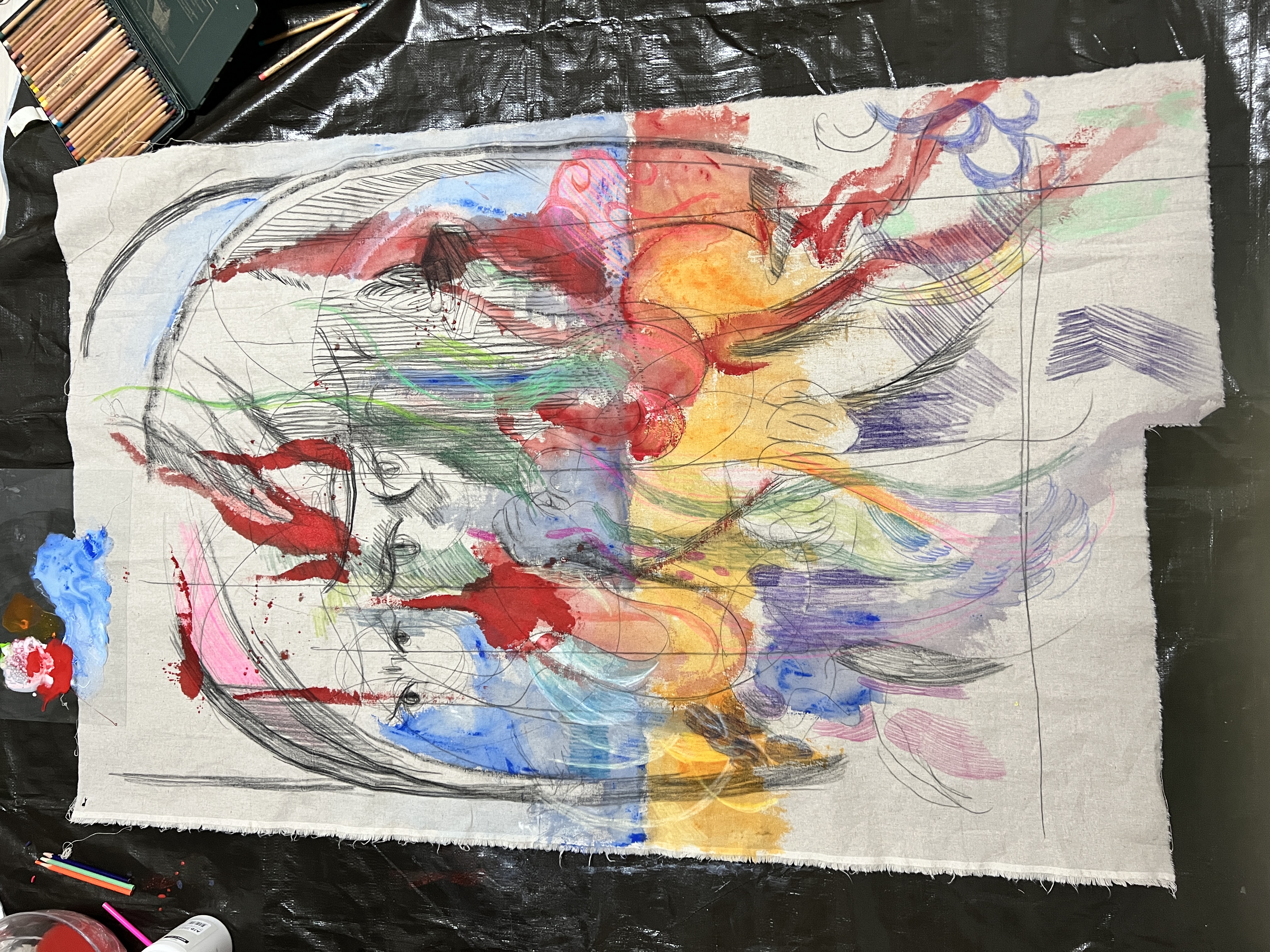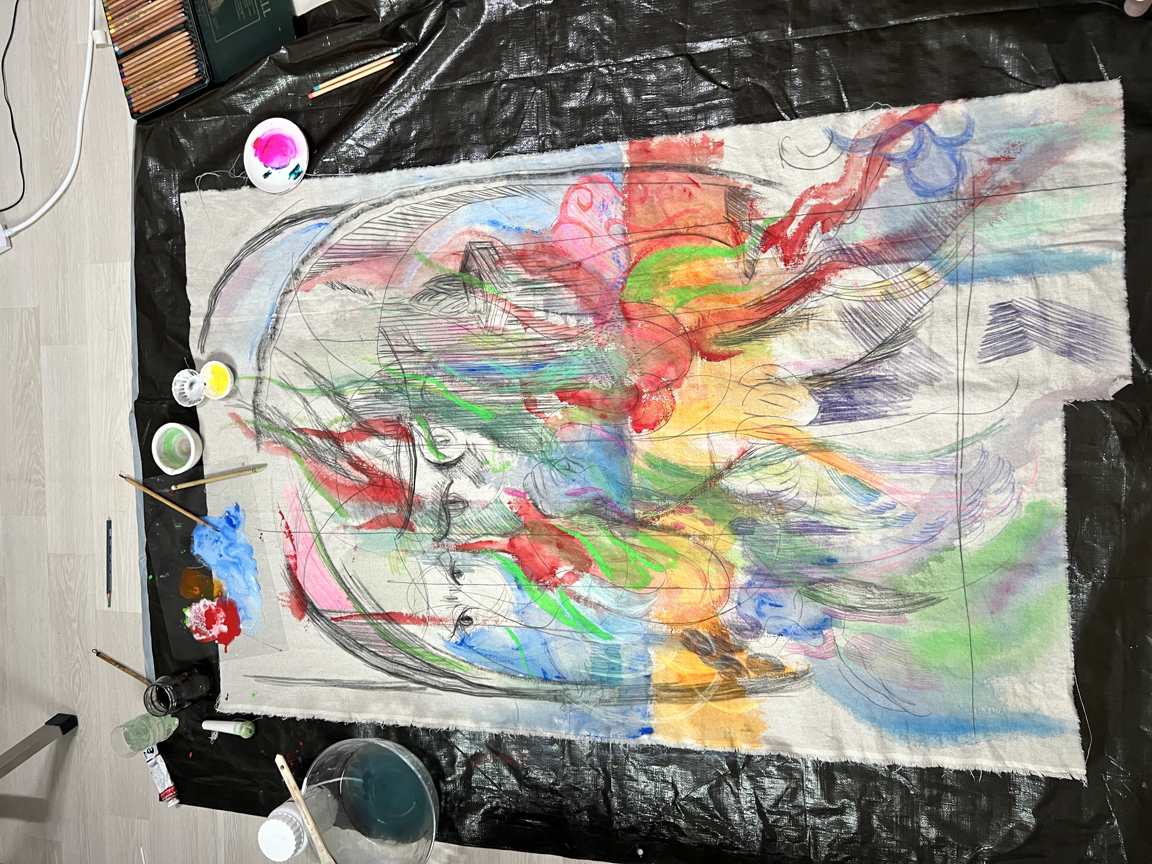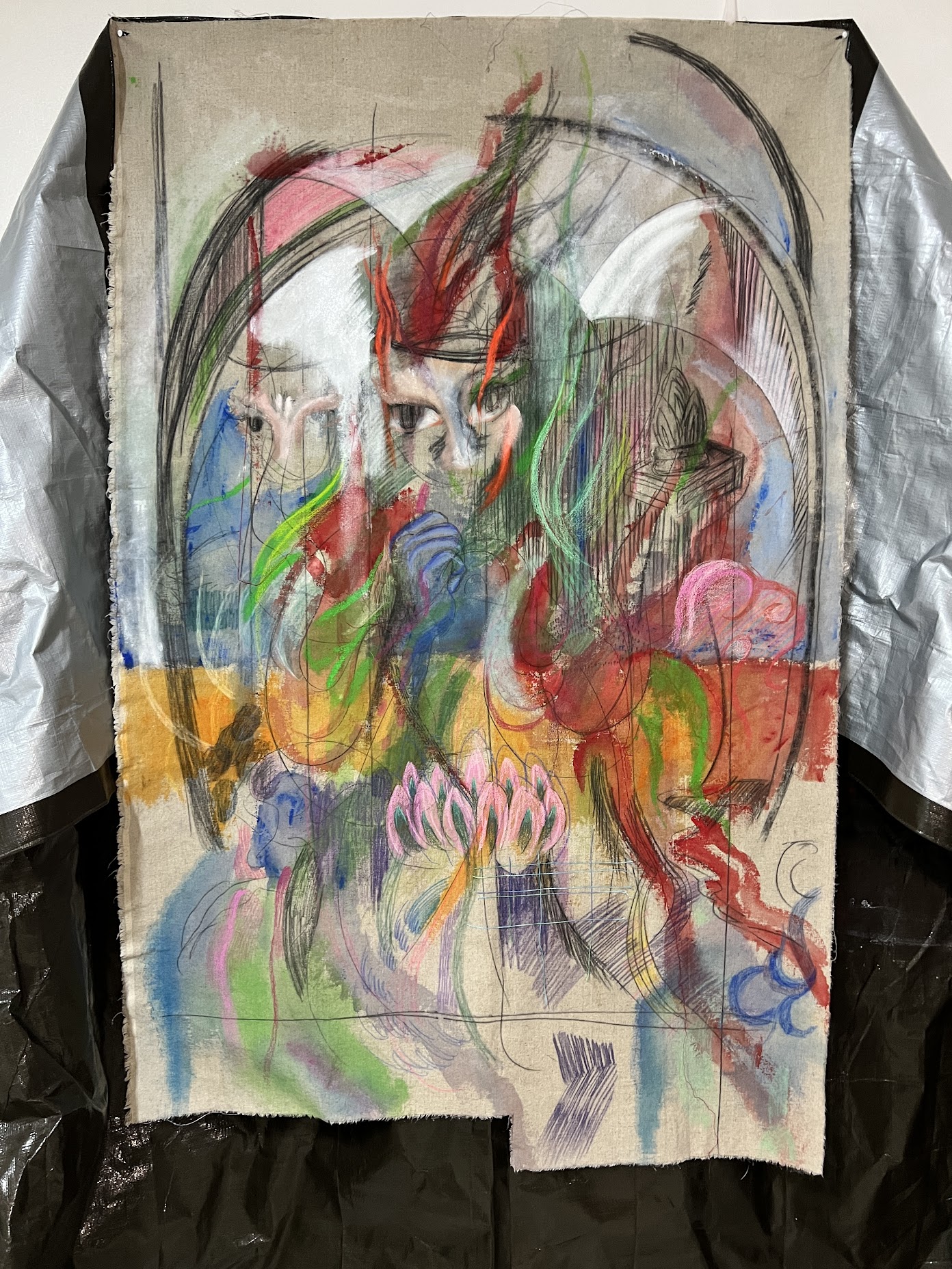Into, marking a transformative shift in my practice, became my most challenging piece since graduation. Just like how one enters into a Buddhist temple and finds one’s self, I entered my internal and emotional space through this painting. It was an attempt to look inward and meditate on the psychological effects of chaotic cyberspace. The obsession with news seems to be derived from my anxiety for control. This obsession is translated into the manipulation and alteration of images digitally, which becomes the foundation of the paintings I create. This painting depicts an existence in flux, simultaneously disassembling and reassembling. Through this process, I let go of how the painting might read to others and instead focused more on the progress of making the painting.